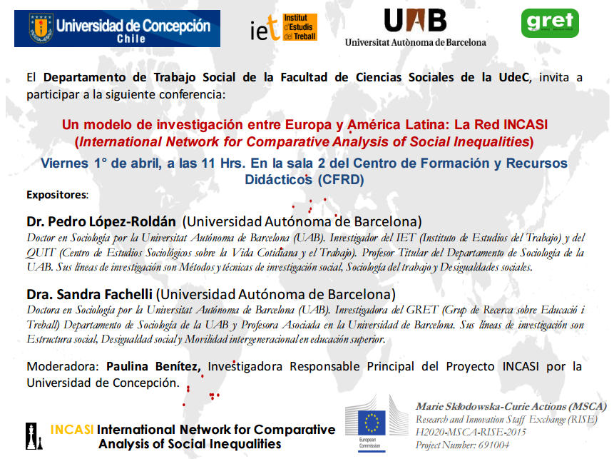 El Departamento de Trabajo Social de la Universidad de Concepción invita a sus estudiantes a la conferencia “Un modelo de investigación entre Europa y América Latina: La Red INCASI (International Network for Comparative Analysis of Social Inequalities)”, dictado por la Dra. Sandra Fachelli y el Dr. Pedro López Roldán de la Universidad Autónoma de Barcelona.
