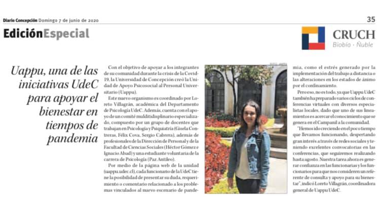 Entrevista a la Dra. Loreto Villagrán, académica del Departamento de Psicología y coordinadora general de la Unidad de Apoyo Psicosocial al Personal Universitario, en Diario Concepción: https://www.diarioconcepcion.cl/edicion-especial/2020/06/07/uappu-una-de-las-iniciativas-udec-para-apoyar-el-bienestar-en-tiempos-de-pandemia.html Esta publicación pertenece al