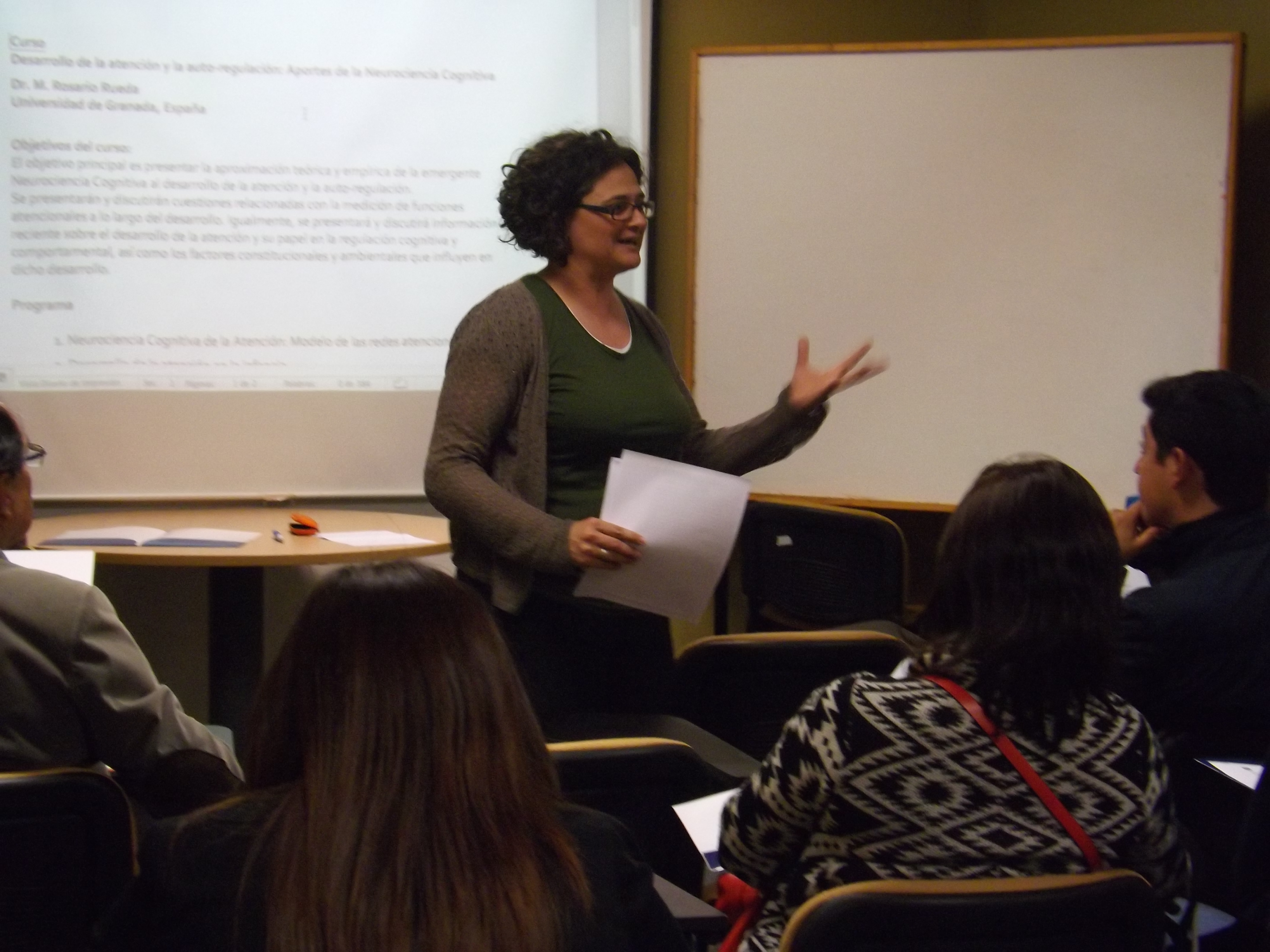 El curso de especialización que comenzó el 9 de abril y se extiende hasta hoy, viernes 11 del mismo mes, se tituló “Tópicos actuales en neurociencia cognitiva: Desarrollo de la Atención y la Autorregulación”. Entre las temáticas que abarcó están: Neurociencia Cognitiva de la Atención (modelo de las redes atencionales), Desarrollo de la atención en la infancia, y Atención y Auto-regulación, en donde se trataron los temas de desarrollo socio-emocional, diferencias individuales en atención, temperamento, genes, experiencia, atención y educación: entorno familiar y social y entrenamiento de la atención.