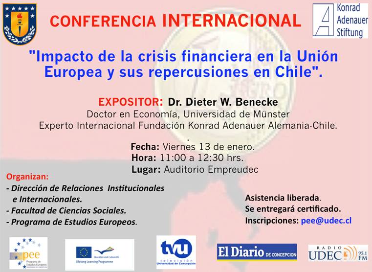 El viernes 13 de enero a las 11 de la mañana se realizará en el Auditorio Empreudec la charla destinada a comprender de mejor manera el incierto estado de la actual crisis financiera en Europa y sus repercusiones en el resto del mundo, incluyendo Chile. Dicha ponencia estará a cargo del Dr. Dieter W. Benecke, Doctor en Economía de la Universidad de Münster y Experto Internacional de la Fundación Konrad Adenauer Alemania-Chile.