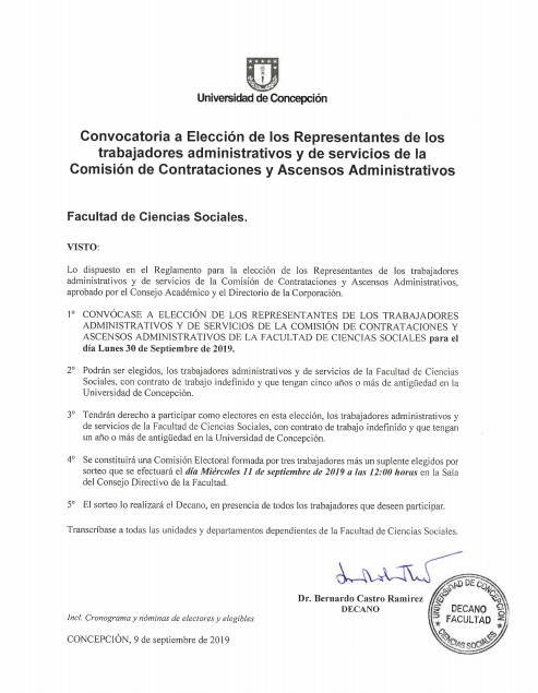Según lo dispuesto en el Reglamento para la elección de los Representantes de los trabajadores administrativos y de servicios de la Comisión de Contrataciones y Ascensos Administrativos -aprobada por el Consejo Académico y el Directorio de la Corporación Universidad de Concepción-, este lunes 30 de septiembre deben desarrollar las elecciones correspondientes para el periodo 2019-2021.
