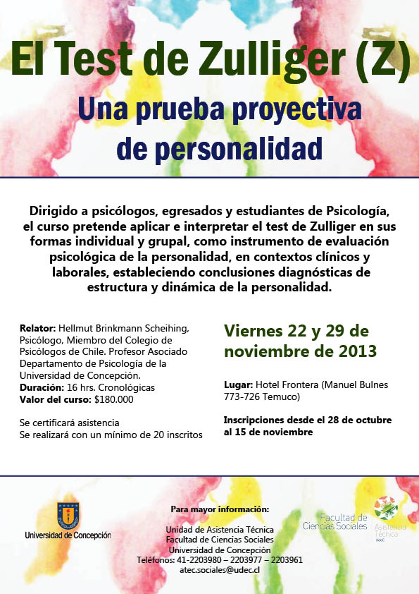 Junto con saludar, les informamos que nos encontramos en el periodo de inscripción al curso “El Test de Zulliger (Z) una prueba proyectiva de personalidad”, dirigido a Psicólogos, egresados y estudiantes de Psicología.