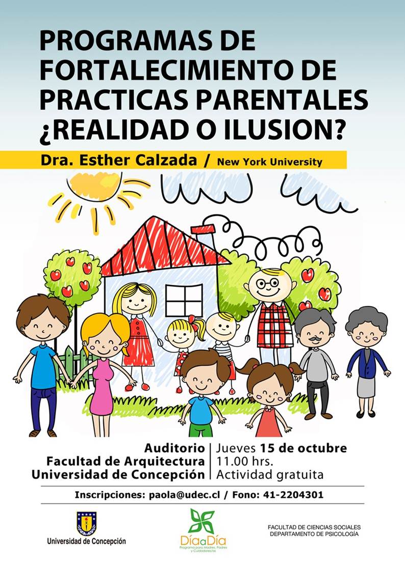afichedosssEl Departamento de Psicología, invita a estudiantes de la carrera de Psicología, así como también a académicos, profesionales de posgrado y comunidad en general a la conferencia «Programas de fortalecimiento de prácticas parentales ¿realidad o ilusión?», en la cual expondrá la Dra. Esther Calzada, de la New York University.