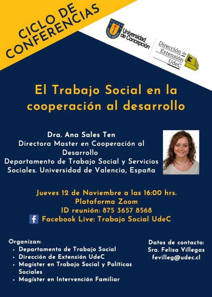 En el marco del exitoso ciclo de conferencias que organiza el Departamento de Trabajo Social de la Universidad de Concepción, la Dra. Ana Sales Ten, profesora de la Universidad de Valencia, ofrecerá la charla “El Trabajo Social en la cooperación al desarrollo”.