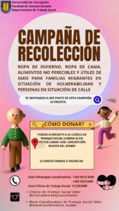 El cuerpo de estudiantes de Trabajo Social de nuestra Facultad hace un llamado altruista para donar elementos imperativos para la vida durante el invierno y así, poder asistir a familias migrantes en condiciones vulnerables y en situación de calle.
