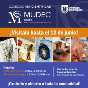 La exposición itinerante «Colecciones Científicas MUDEC» que reune a las facultades de Ciencias Naturales y Oceanográficas, Ciencias Químicas, Medicina y Ciencias Sociales, para la celebración de los Días del Patrimonio 2022, permanecerá abierta a todo público en el hall de la Facultad de Ciencias Químicas hasta el próximo domingo 12 de junio, extendiendo la invitación a delegaciones educativas y colegios que quisieran precenciar las muestras, facilitando un enlace de inscripción.