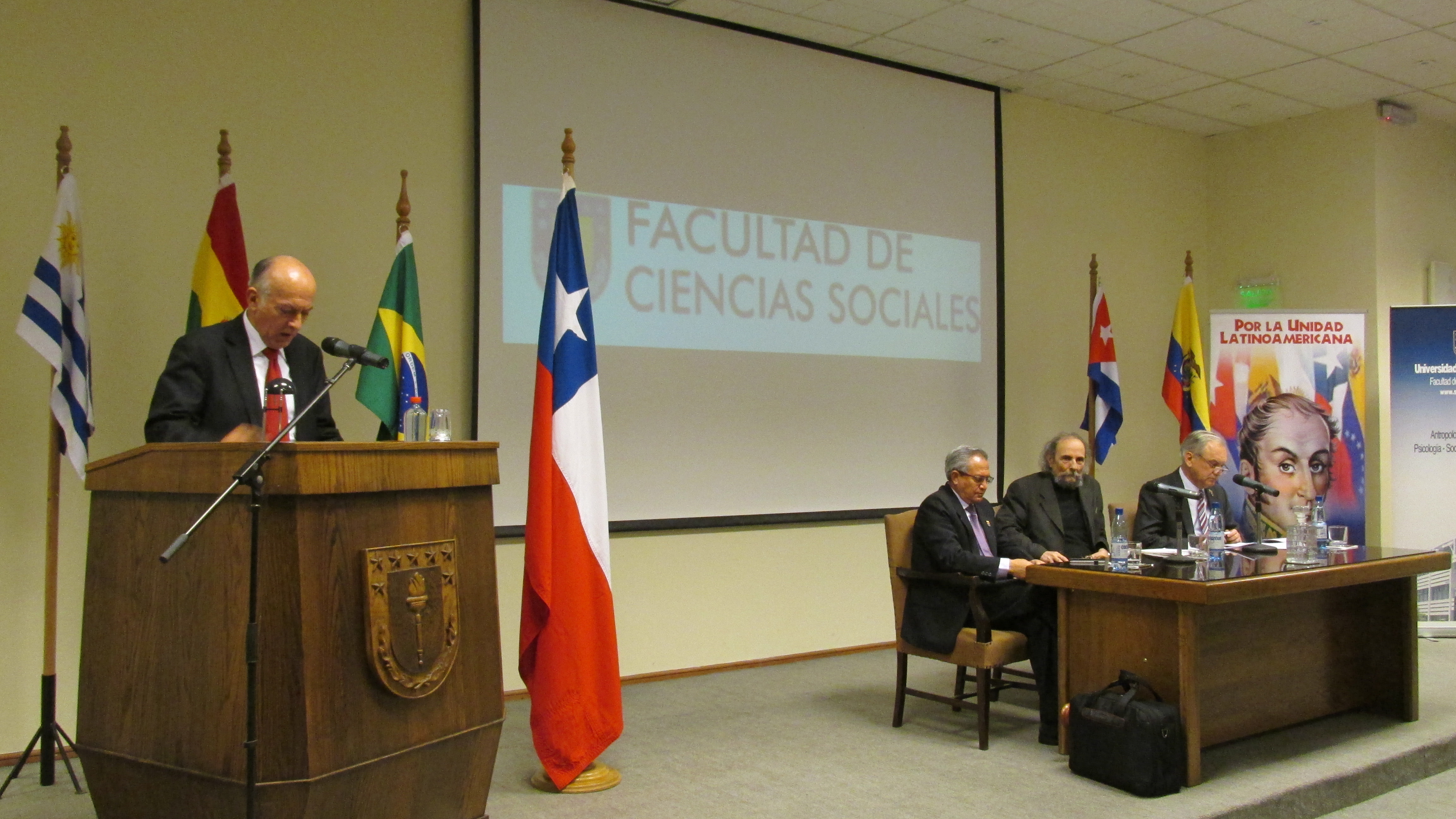 El Dr. Bernardo Castro, Decano de la Facultad de Ciencias Sociales al dar la bienvenida a los expositores señaló «que Chile no se entiende sin América Latina y que debemos reforar la cooperación y amistad con los países hermanos».