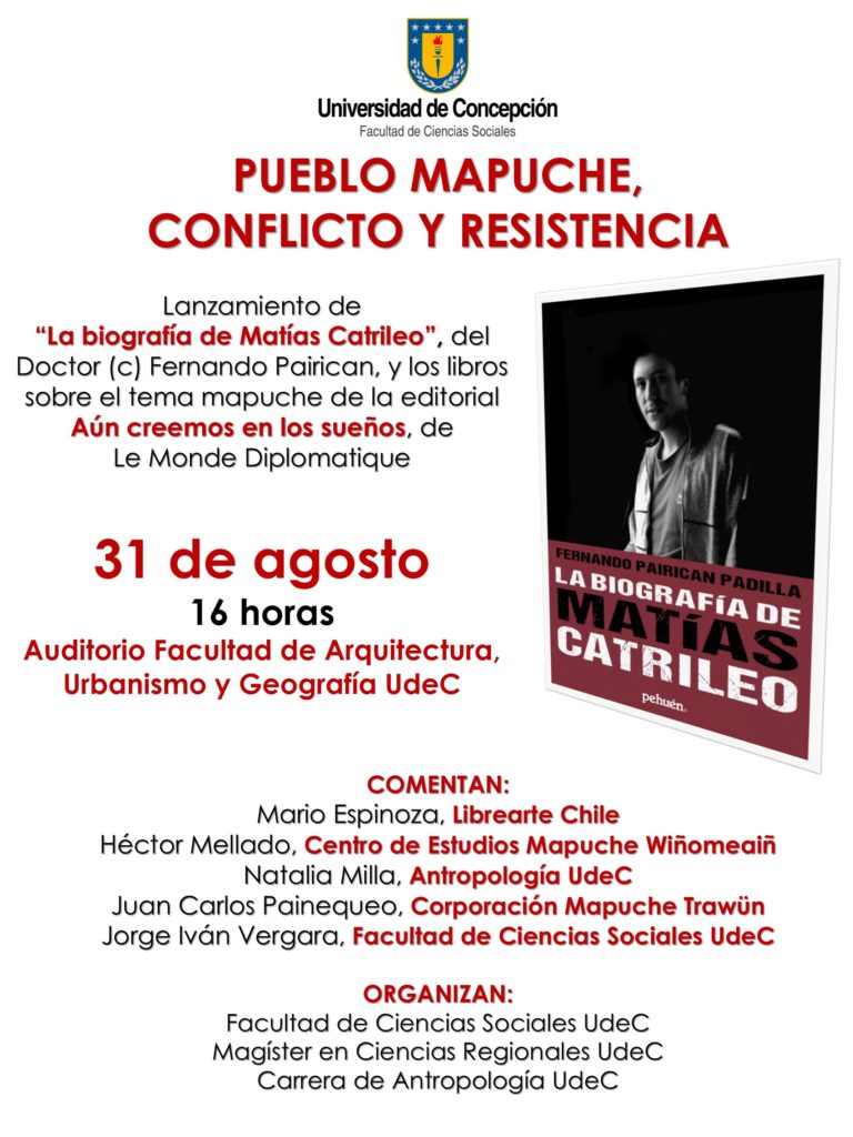 La actividad, organizada por la Facultad de Ciencias Sociales, el Magíster en Ciencias Regionales y la carrera de Antropología de la Universidad de Concepción, contempla los lanzamientos de los libros sobre el tema mapuche de la editorial Aún creemos en los sueños, de Le Monde Diplomatique; y “La biografía de Matías Catrileo”, Fernando Pairican.