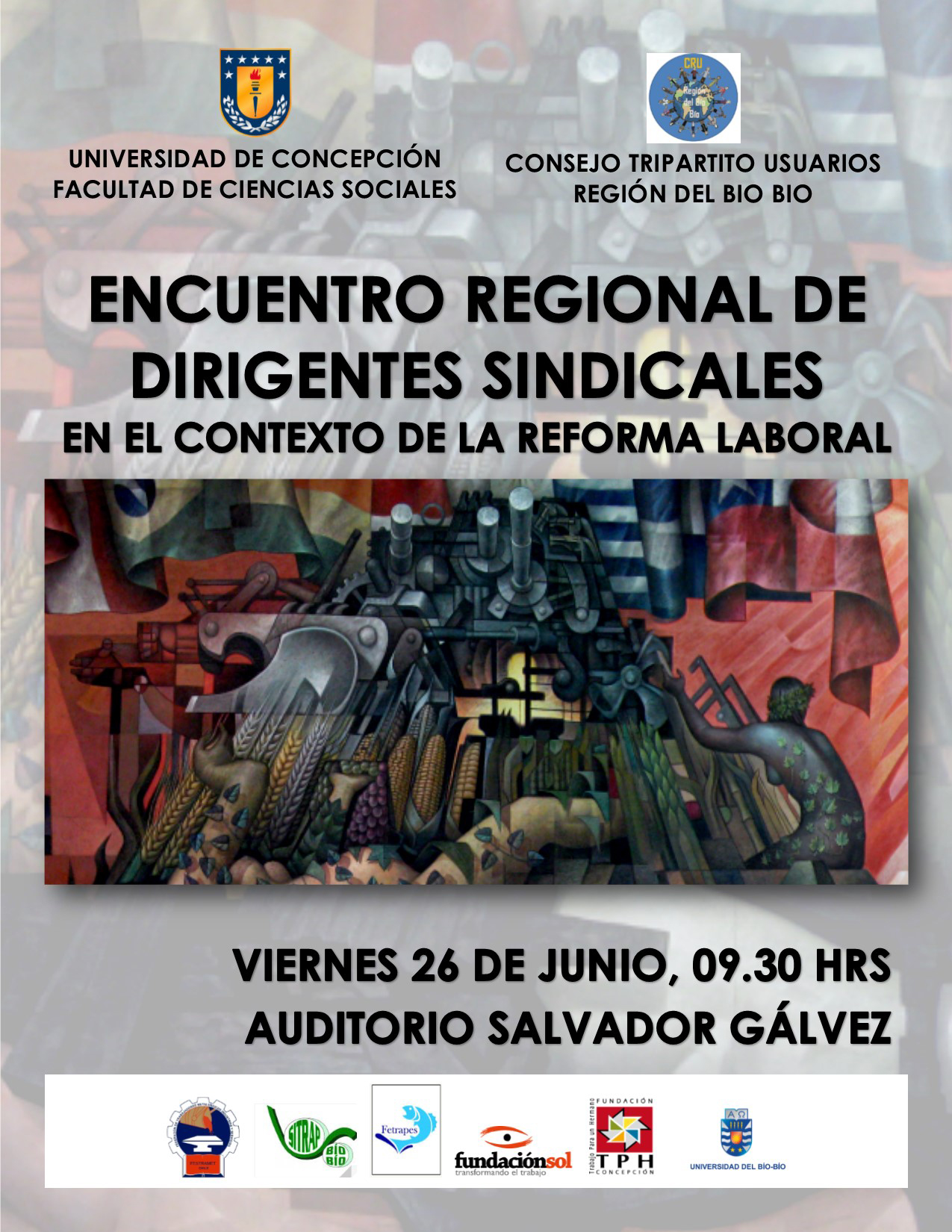 AFICHE ACTIVIDADEl Consejo Tripartito Regional de Usuarios de la Dirección del Trabajo y el Decano de la Facultad de Ciencias Sociales, Dr. Bernardo Castro Ramírez, invitan a participar en el “Encuentro Regional de Dirigentes al momento de la discusión de la Reforma Laboral”.