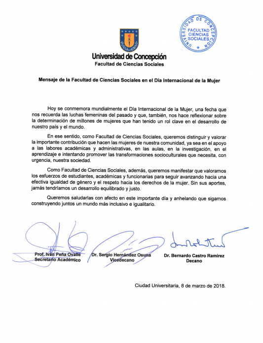 Como Facultad de Ciencias Sociales, además, queremos manifestar que valoramos los esfuerzos de estudiantes, académicas y funcionarias para seguir avanzando hacia una efectiva igualdad de género y el respeto hacia los derechos de la mujer. Sin sus aportes, jamás tendríamos un desarrollo equilibrado y justo.