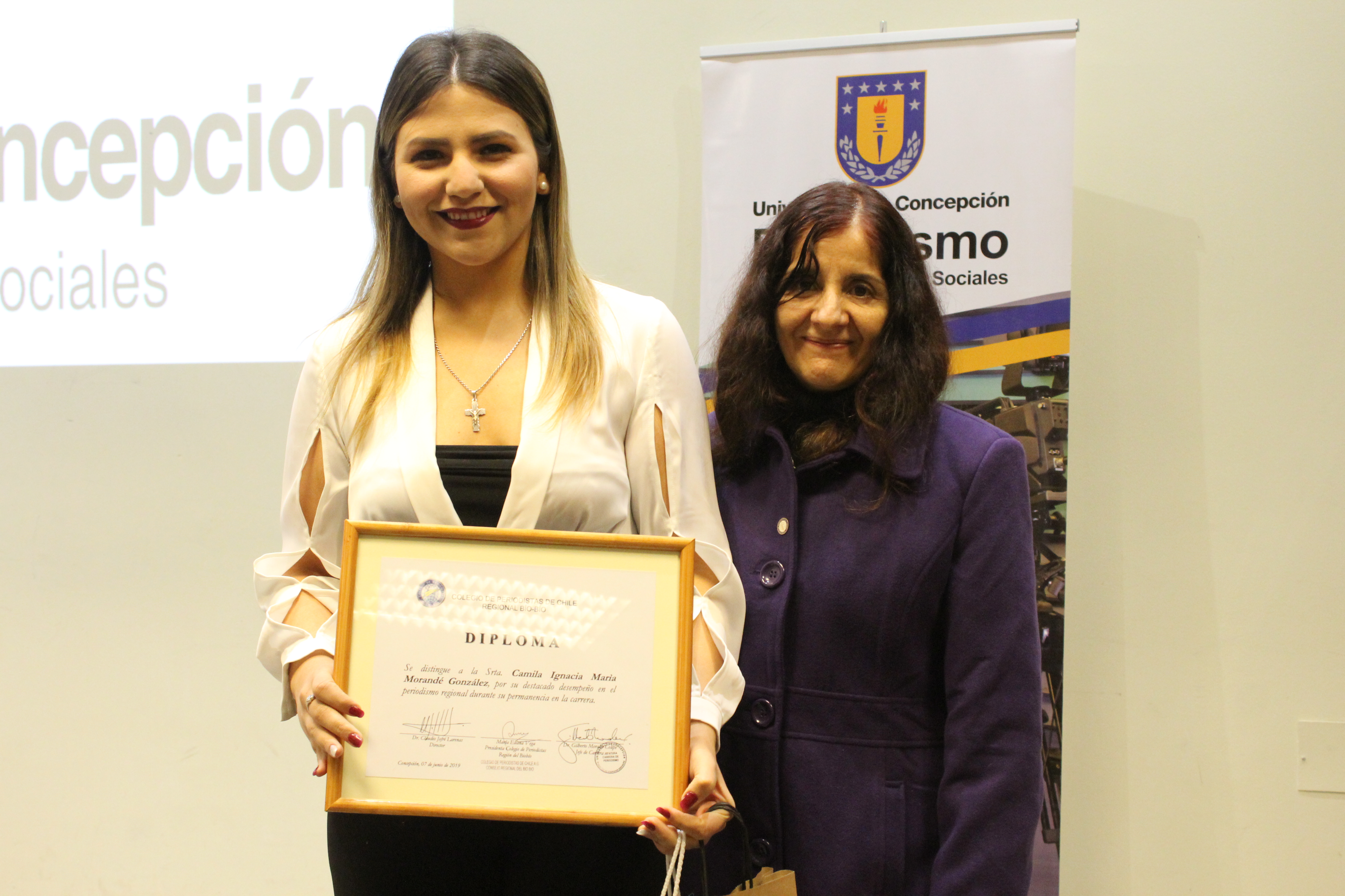 Una vez finalizada la entrega de los documentos que validan el egreso de las aulas, se distinguieron a las periodistas Macarena Sandoval, quien obtuvo el Premio Universidad de Concepción y el Premio Alumna Integral; Josefa Araya y María Alejandra Soto, quienes compartieron el Premio a la Mejor Compañera de la Promoción; y Camila Morandé, quien recibió el Premio a la Trayectoria del Consejo Regional del Colegio de Periodistas de Chile.