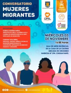 Esta actividad se realizará de manera presencial en la Sala de Artes Escénicas, de la Casa de la Cultura de Chiguayante (Orozimbo Barbosa 294). Junto a la docente, también participará Carolina Tapia Fierro, asesora jurídica de la Oficina de Migrantes de la Municipalidad de Concepción.