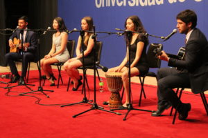 Una vez realizada la distinción a los nuevos profesionales, un quinteto de egresados desarrolló un interludio musical en el que se interpretaron temas de Joe Vasconcellos, Los Prisioneros y Silvio Rodríguez.