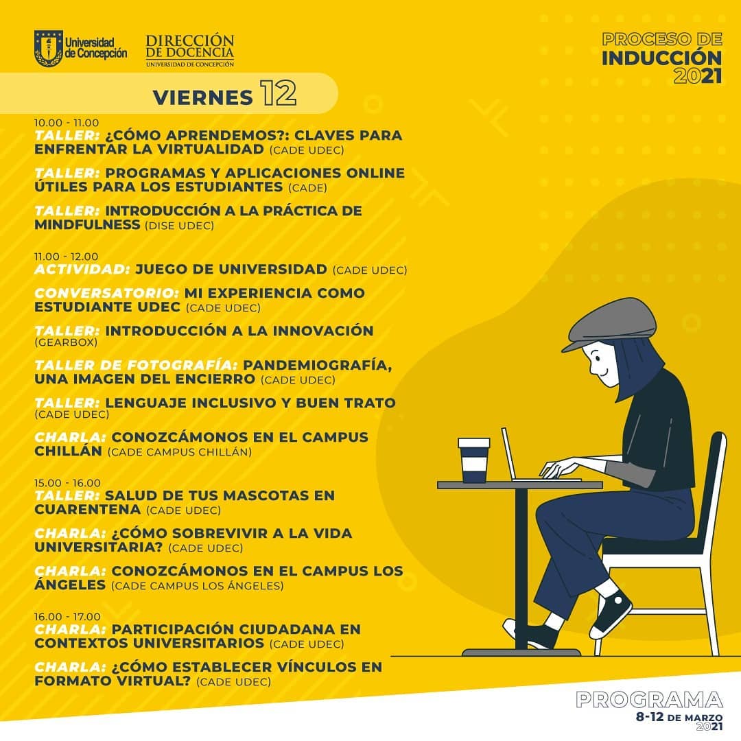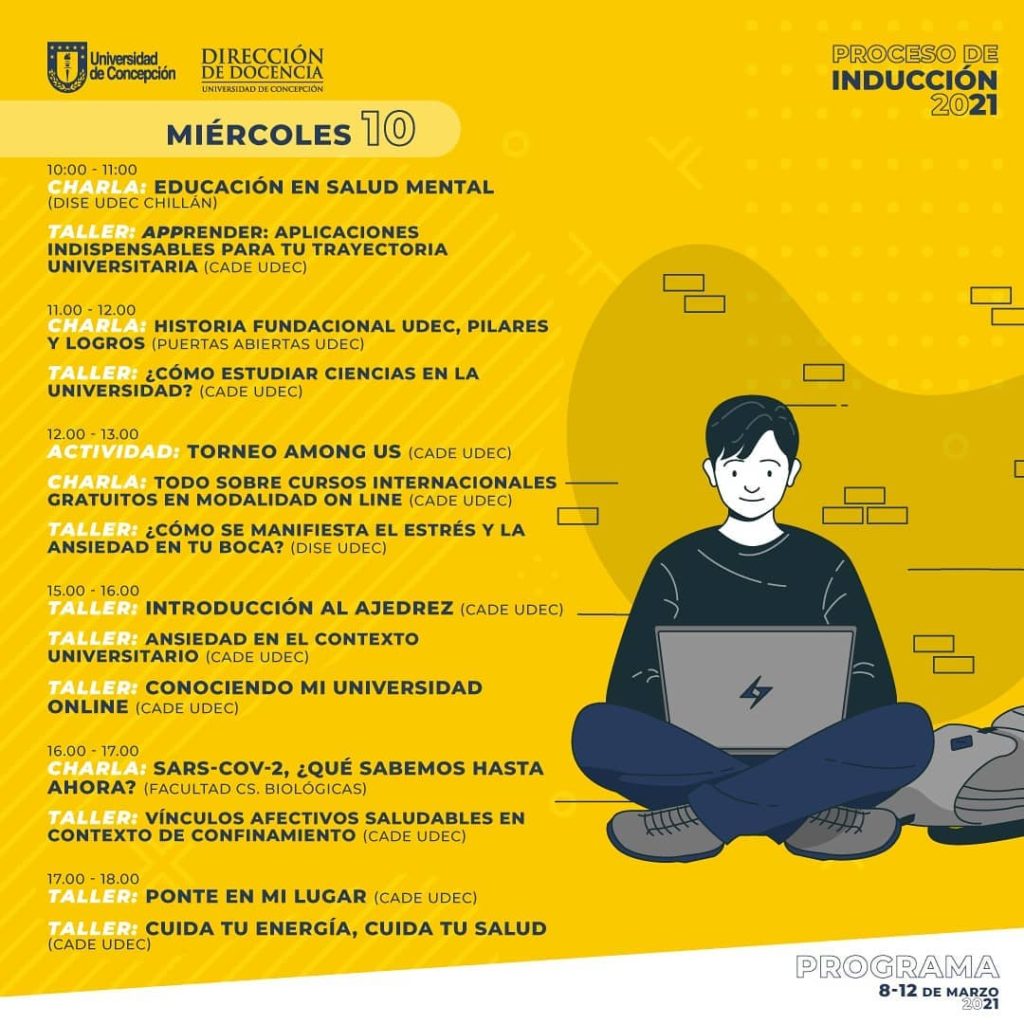 Si eres estudiante de primer año, acá hay una invitación para ti. Para darte la bienvenida y acompañar tu proceso de adaptación a la Universidad de Concepción, se realizarán cuatro días de charlas, talleres, juegos, concursos, instancias en las que podrás conocer mejor tu campus, aprender sobre cómo manejar las exigencias académicas, oír a docentes exponiendo sobre temas actuales, conocer a otros alumnos y alumnas, compartir con tus compañeros y compañeras de carrera fuera del «aula» y sentirte parte de nuestra de la UdeC.