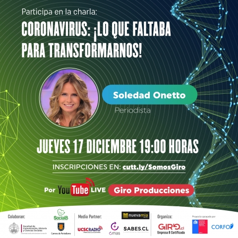 El nombre de esta séptima y última ponencia del ciclo de charlas se denomina “Coronavirus: ¡Lo que faltaba para transformarnos!”. El webinar es abierto y gratuito a todo público, previa inscripción en https://cutt.ly/SomosGiro, y se transmitirá en la fecha señalada en el canal de YouTube de Giro Producciones.